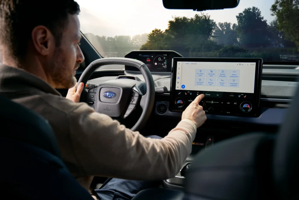 Bak rattet i nye Subaru Solterra finner du et oversiktlig og behagelig førermiljø, der alt er lagt til rette for en trygg og god kjøreopplevelse. Det digitale instrumentpanelet og den brukervennlige berøringsskjermen gir deg all nødvendig informasjon lett tilgjengelig uten å ta blikket bort fra veien. Midtkonsollen er praktisk utformet med to trådløse ladeplasser og USB-porter for enkel tilkobling og lading.